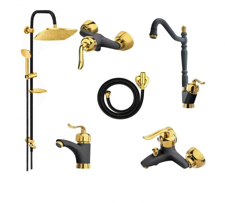 ست شش عددی شیرآلات مشکی طلایی مدل قاجاری به همراه علم دوش مشکی دارای قیمتی مناسب و کیفیت بالایی در ساخت می باشند این مجموعه شامل ست کامل شیرآلات بهمراه علم دوش دو کاره مشکی و شلنگ توالت موجود در جعبه محصولات این شرکت می باشد.